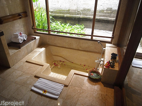打從我們踏入小屋起,就發現屋內處處佈置著雞蛋花及扶桑花,浴室裡也預先點好香精油燈。Kamandalu也許是個有點歷史的villa,但是從建材的挑選到家具的搭配,處處可見到設計者的用心,她所表現出來的是一派的優雅自若,而非跟從潮流、隨時會看膩的標新立異,從前我並不會看Architectural Digest這一類的雜誌,因為不夠刺激啊,但是現在,我漸漸可以體會這種的設計的歷久彌新。