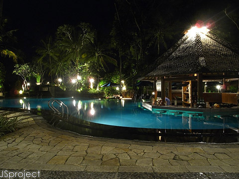 穿過諾大的大廳,拾級而下經過層層疊疊的梯田,大塊大塊的綠色和穿插其中的造景配合的天衣無縫。在這裡,葫蘆型的游泳池會讓人直覺會想到電影裡面大老闆叼根雪茄躺在躺椅上,比基尼美女環繞的畫面。泳池由深淺三種池子組成,數組躺椅就這麼站在淺水灘中,最深的泳池中間還有bar,下午時可以坐在水中的吧檯椅上喝免費的酒,在我們經過時,裡面酒保還大叫:Best of today(羞)。