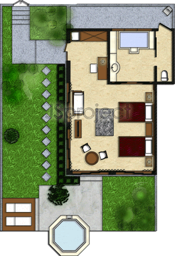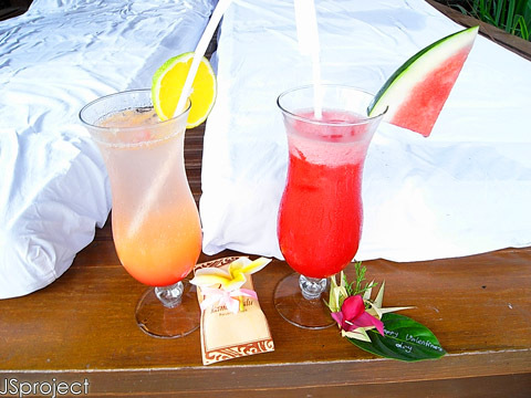 我們住的是Jacuzzi villa,顧名思義就是有個戶外按摩池的小屋。小屋的屋頂是用茅草密密麻麻的疊在一起做成的,儘管第二天很不巧的就下起了大雷雨,屋內卻乾乾爽爽的。有著厚厚屋頂的小屋十分可愛,面向山谷及花園的牆面都使用木框的玻璃拉門,並有著厚厚的落地窗簾,天氣晴朗時可以全部打開和室外連成一氣,到了入夜之前,服務人員會敲門進入,悄悄的將所有窗簾拉上,安排好夜晚的燈光,並貼心的放上和花朵一同紮好的隻字片語及糖果。