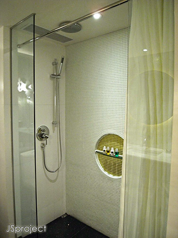 另外浴室地面整體使用亮面羅馬崗石,對使用者也是一個潛在的危機(雖然我超愛這種夾雜鏡子碎片的地磚在燈光下華麗的演出),加上淋浴間排水溝槽的高低差設計導致我在洗完澡後在高低差上打滑,整個腳底板黑青,所以,除非使用者是設計師本人,浴室裡還是避免使用光面地磚和盡量不要有高低差的好啊。