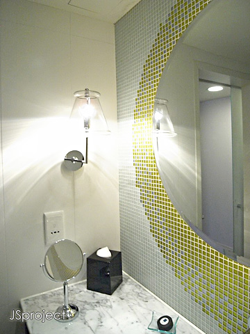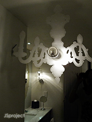 設計師注意到了炫光的問題,在化妝鏡的一側以及馬桶上方的燈具中使用的光源都是附有遮光膜的燈泡,且最令人驚艷的就屬如廁區的設計了,設計師大膽的在如廁區使用墨鏡,並將燈光與虛幻的噴砂水晶燈圖案巧妙的結合,使得原本在茶色鏡上不起眼的噴砂造型在燈光的照耀下,變成了一盞迷幻而魅惑十足的燈具,所謂的設計就是以簡單的手法達到加成的效果,這位設計師在這裡辦到了。